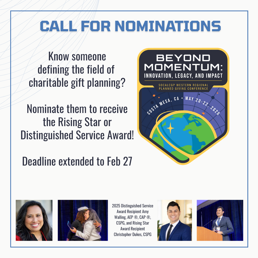 About the SoCalCGP AwardsDistinguished Service AwardThe SoCalCGP Distinguished Service Award honors individuals for outstanding accomplishments in charitable gift planning. Their achievements reflect SoCalCGP’s core values of inclusion, community, integrity, education, and leadership, demonstrated through their professional work, leadership, and volunteer contributions. Established in 2012, this annual award recognizes those who have made a lasting, positive impact on the field of charitable planning. Criteria for selection include significant contributions to the field, at least a decade of service, and optional SoCalCGP membership. Rising Star AwardThe SoCalCGP Rising Star Award celebrates an emerging professional in charitable gift planning. Established in 2024, this annual award recognizes individuals who demonstrate initiative, innovation, and leadership, and who are actively contributing to and supporting the gift planning field. Their work reflects SoCalCGP’s core values of inclusion, community, integrity, education, and leadership, and highlights a strong commitment to professional growth and service. Selection criteria include demonstrated success in charitable gift planning, leadership potential, between three and ten years of service in the field, and engagement with SoCalCGP or other professional organizations. Recipients are recognized at the Western Regional Planned Giving Conference and featured on SoCalCGP’s website and associated media.